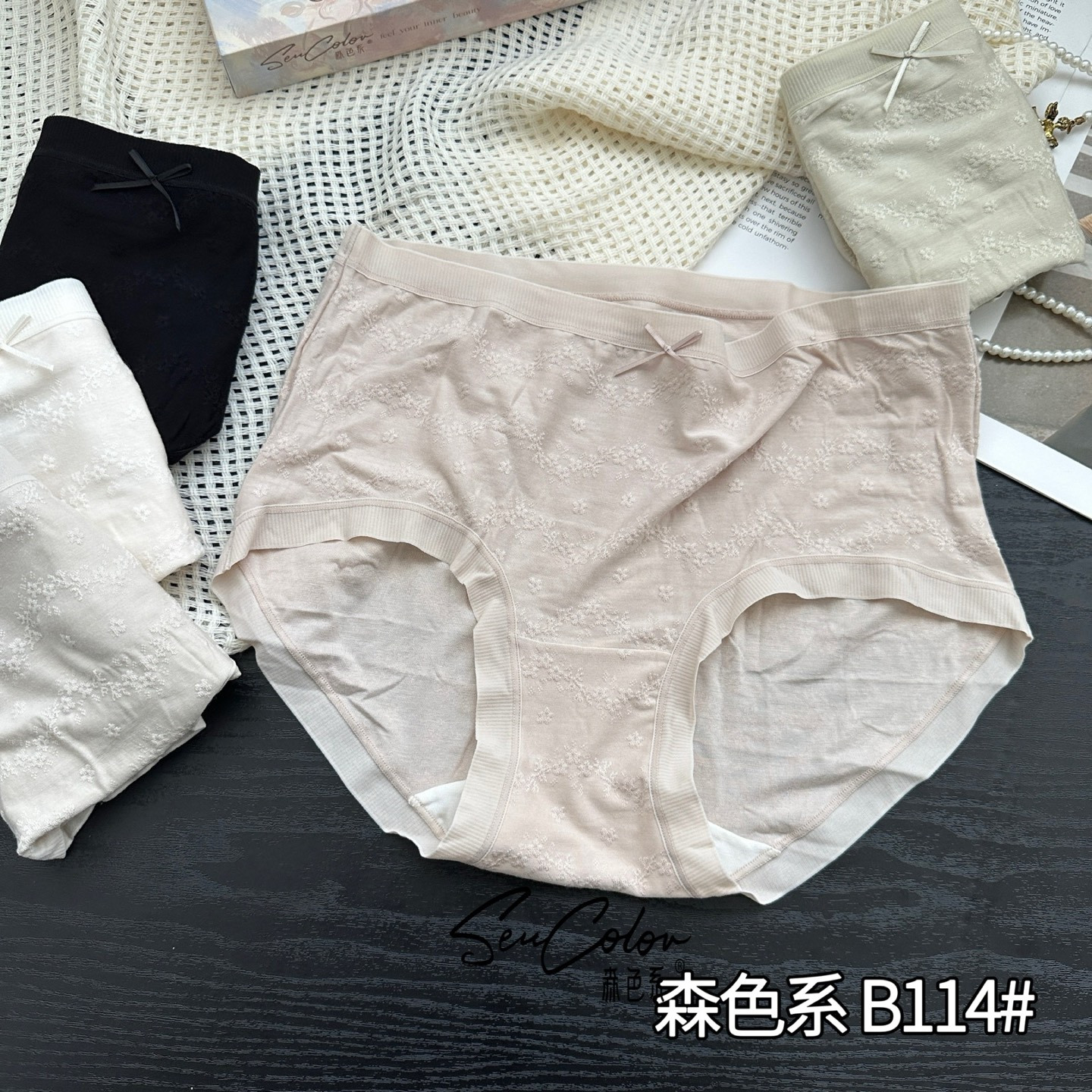 森色系性感刺绣花朵透气轻薄高弹蝴蝶结柔软中腰三角短内裤女B114