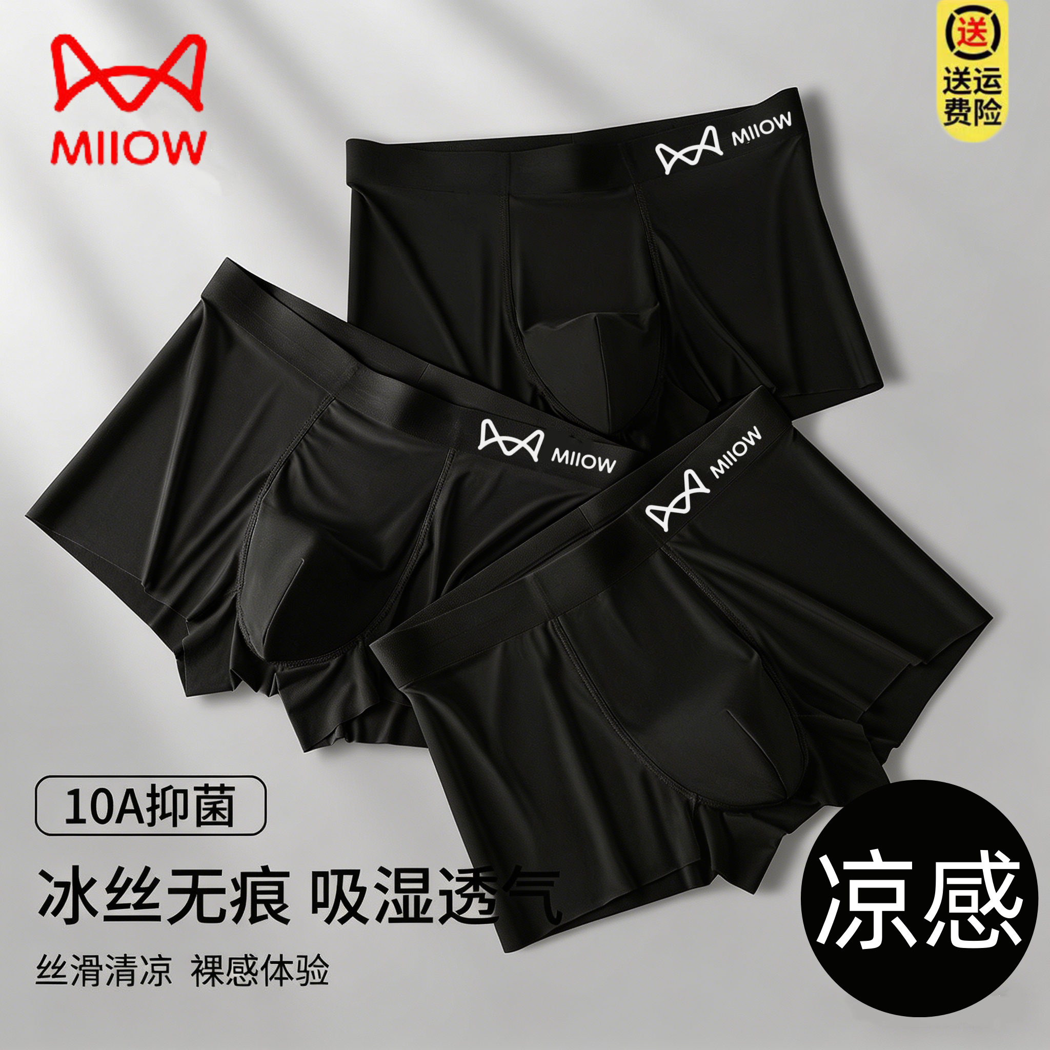 猫人男士内裤黑色无痕冰丝10A级抗菌平角夏季男运动透气四角短裤