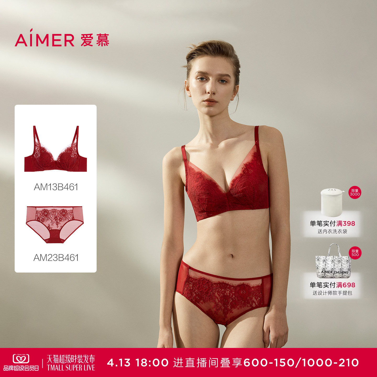 爱慕光羽蕾丝红色花瓣内衣女薄杯隐孔蕾丝大胸显小文胸内裤套装