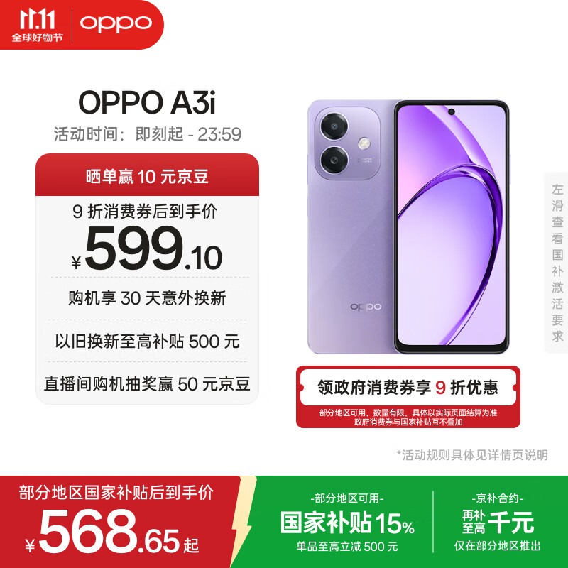 OPPO A3i 6GB+128GB 星辰紫 抗摔抗水溅 5100mAh大电池 45W闪充 120Hz高刷 5G 老人智能手机 国家补贴