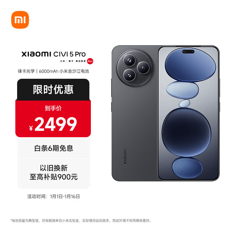 小米(MI)Xiaomi Civi 5 Pro 第四代骁龙8s 全能轻薄旗舰 12GB+256GB 黑色 小米5g手机 国家补贴