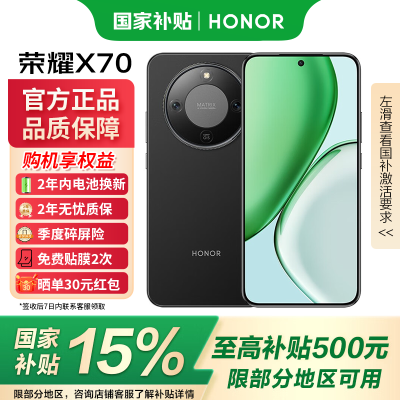 荣耀X70 金标十面抗摔 8300mAh青海湖电池 IP69防水 荣耀绿洲护眼屏 AI手机 国家补贴 幻夜黑 8GB+128GB