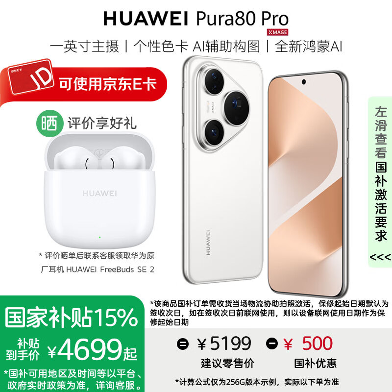 华为Pura 80 Pro手机【国家补贴500元+晒单送华为蓝牙耳机】 釉白 12GB+512GB 官方标配