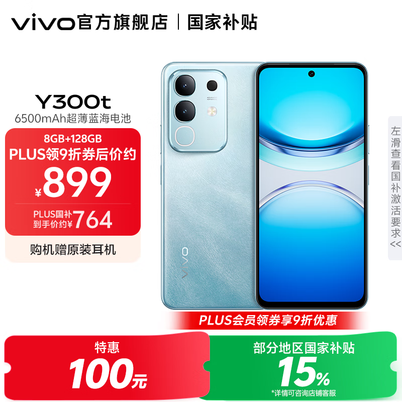 vivo Y300t 手机 6500mAh超薄蓝海电池 天玑7300长久流畅芯片 磐石抗摔结构 军工级耐用品质 拍照 手机 海蓝 8GB+256GB