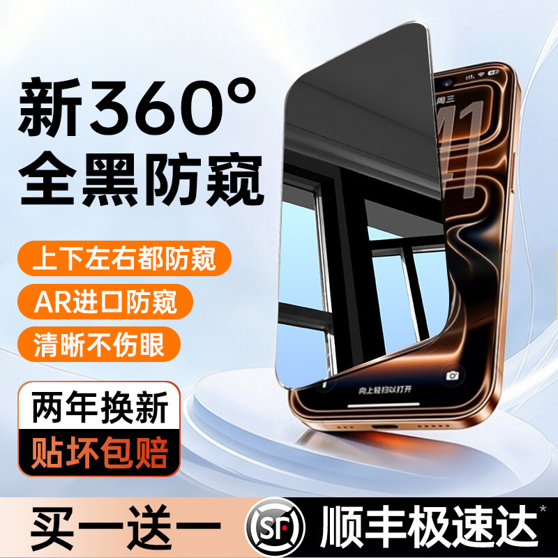 [新360°AR全黑防窥膜]铂信适用苹果17/16promax防窥膜iphone15钢化膜防偷窥14Pro手机13全屏12防尘air防窥屏