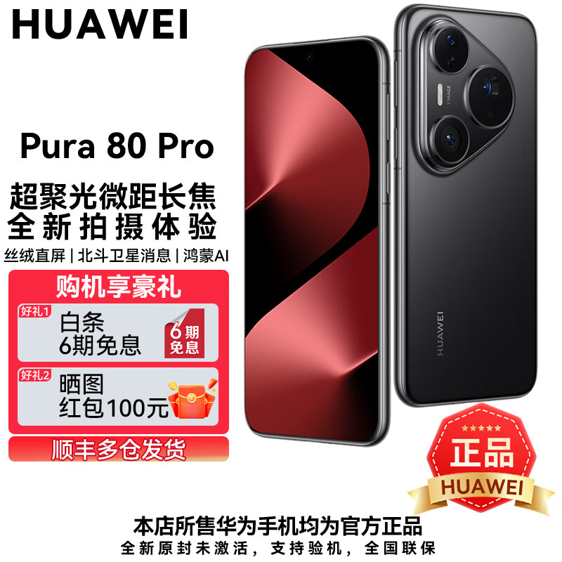 华为Pura 80 Pro【6期分期免息】新机2025上市旗舰机 HUAWEI pura80pro系列 p80鸿蒙AI智能华为手机 釉黑 12GB+512GB 官方标配