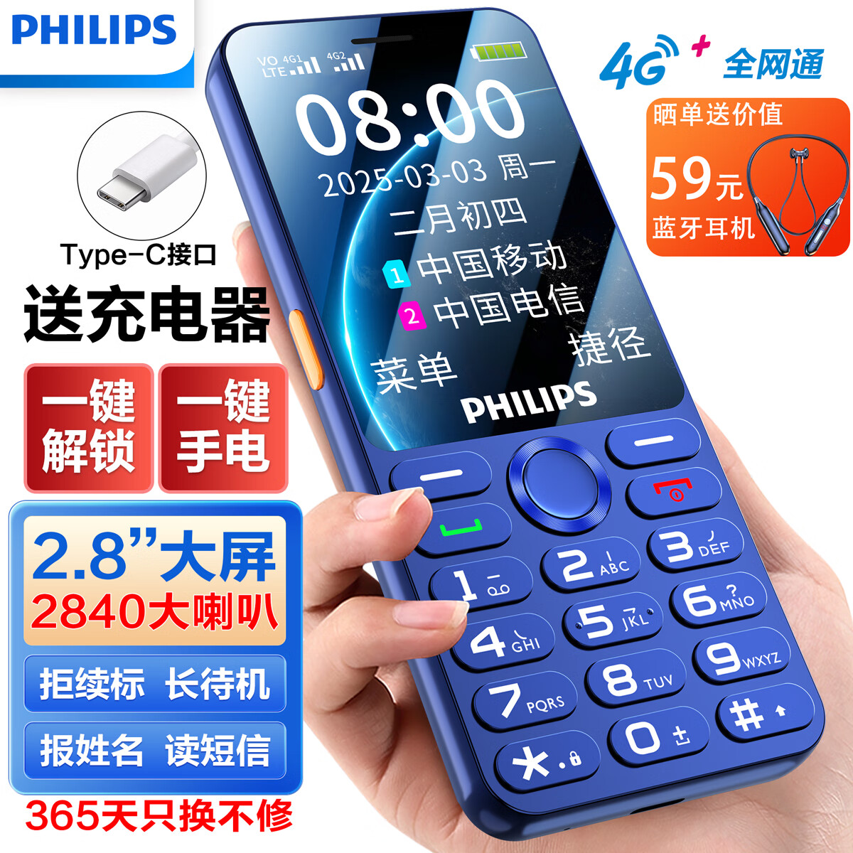 飞利浦(PHILIPS)P319 全网通4G老年人手机大喇叭大电池超长待机大声音智能易用大屏大字学生专备用按键手机 宝石蓝