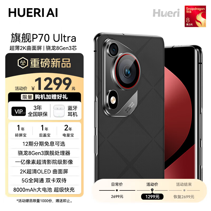 HUERIAI新款手机全新P70Ultra 2K曲面屏5G全网通 骁龙8GEN3 一亿像素8000毫安 指纹+人脸秒解锁 大屏AI 陶瓷黑 20GB+1TB 官方标配