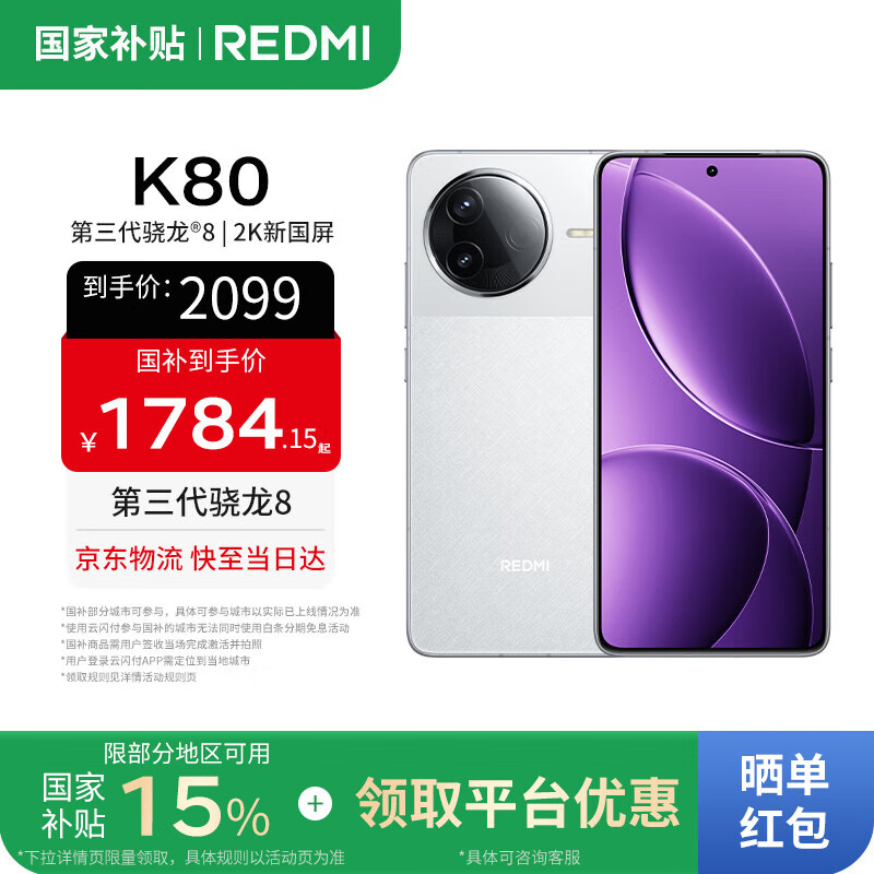 小米REDMI K80 【国补】手机游戏性能小米手机 白色 12GB+256GB 官方标配