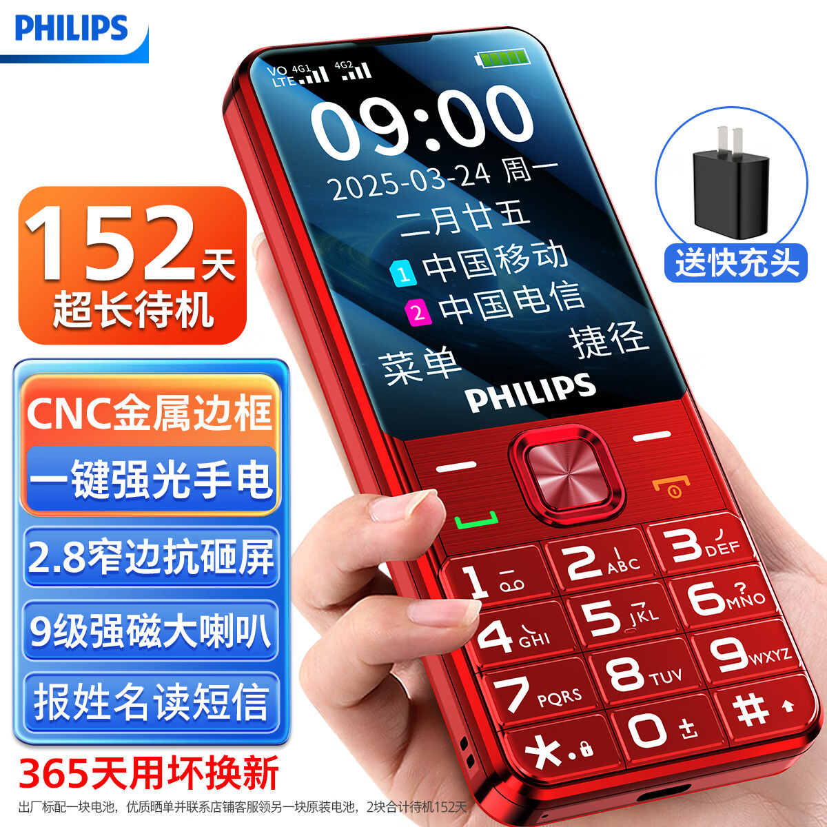 飞利浦(PHILIPS)老年手机4G全网通大电池超长待机大声音耐磨耐摔大屏大字大按键老年人专用学生功能机 T910绚丽红