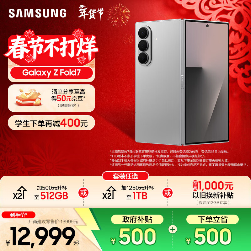 三星(SAMSUNG)Galaxy Z Fold7 轻薄8英寸大屏2亿像素主摄 视觉引擎 Galaxy AI 折叠屏手机 星夜银 12GB+512GB 享24期分期免息
