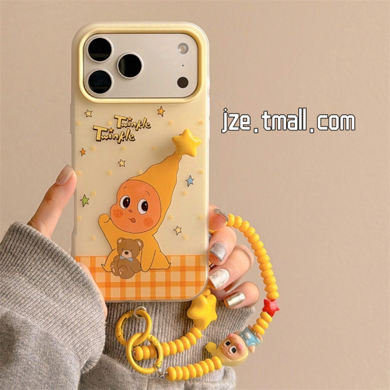 jze 可爱黄波点格纹旋转星星小人挂绳适用苹果17ProMax手机壳iphone15新款16pro女13二合一15pro防摔保护套14