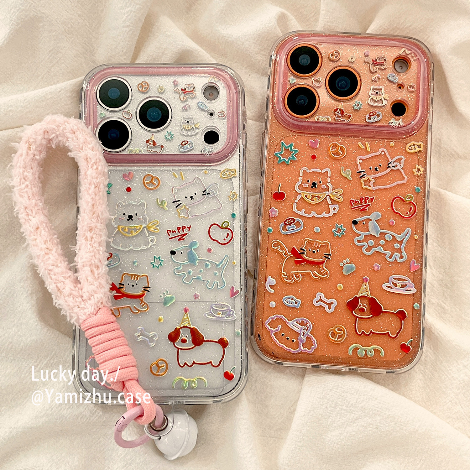可爱卡通小狗猫咪涂鸦带挂绳适用苹果17PRO手机壳iPhone16ProMax新款15pro女款小众13硅胶14防摔透明全包软壳
