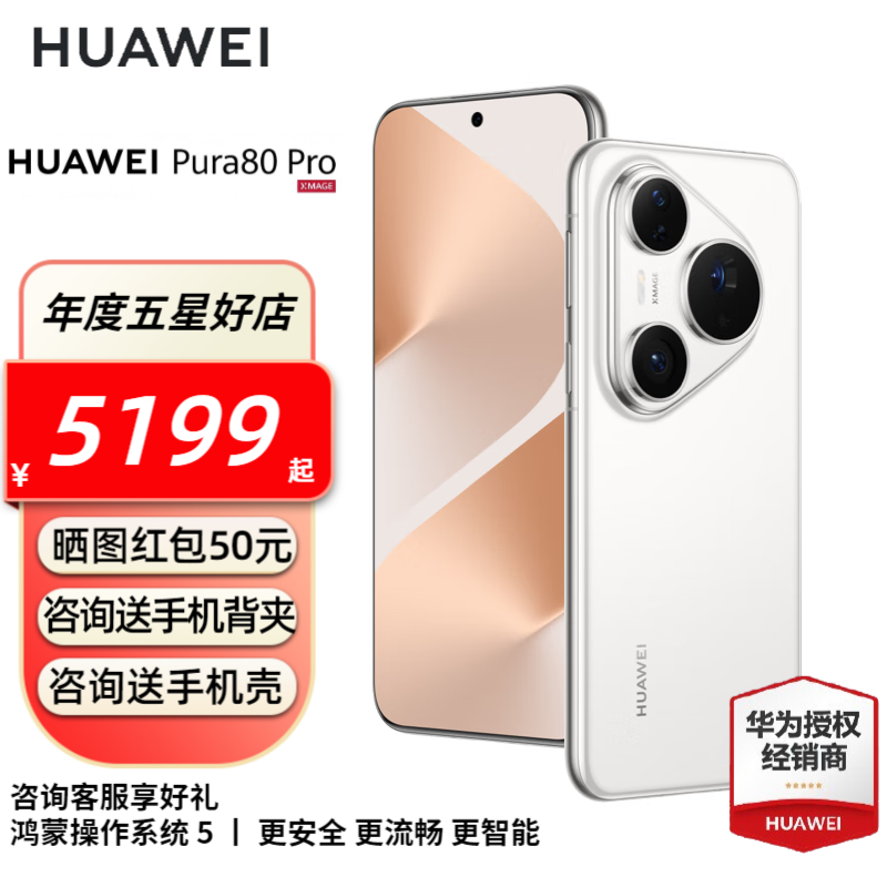 HUAWEI Pura 80 Pro 新品旗舰手机 p80pro 一英寸主摄 个性色卡 AI辅助构图 华为pura80pro手机 现货速发 釉白 12GB+512GB 全网通 官方标配