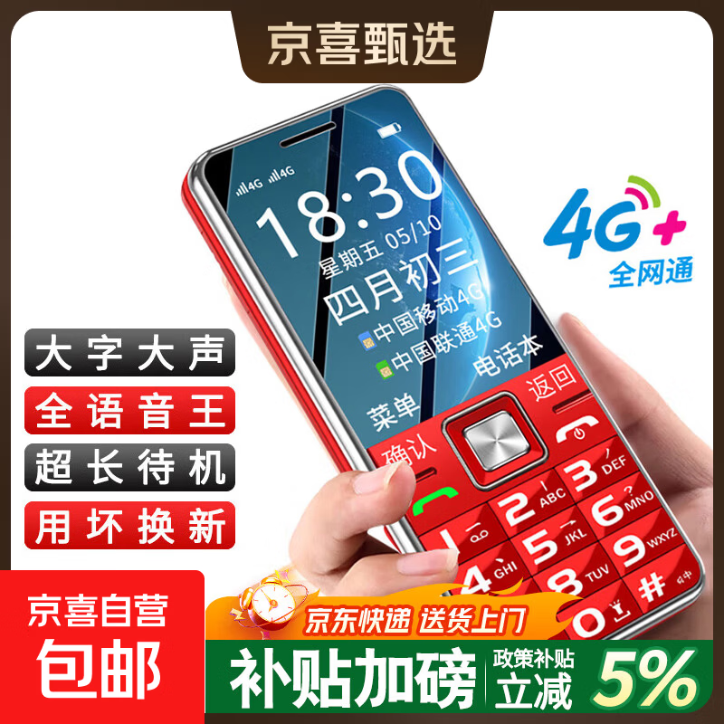 老年人手机国家补贴 4G全网通超长待机直板按键 大字大声音大屏大按键 学生专用商务备用功能机 红色