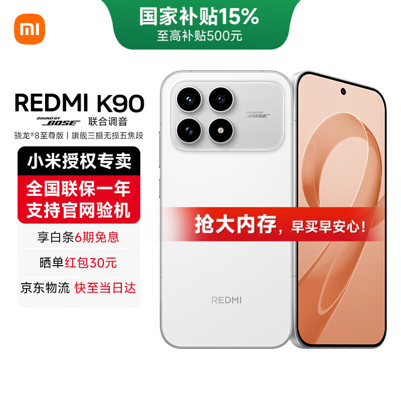 小米(MI)红米K90 骁龙8至尊版 一体冷雕玻璃机身 新品 5G 拍照手机 白色 12GB+512GB 国家补贴15%