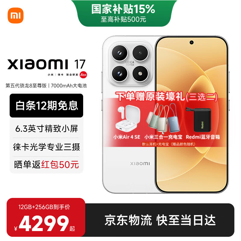小米(MI)小米17 国家补贴 旗舰影像 徕卡光学镜头大师人像 第五代骁龙8至尊版 超窄四等边 新品5G小米手机 白色 12GB+256GB 【官方标配】
