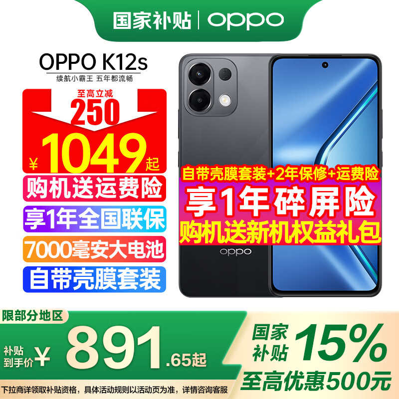 OPPO【国家补贴立减15%】OPPO K12s 手机新品上市 oppok12s 全网通5g手机 7000mAh长寿大电池 80W闪充 棱镜黑 8GB+256GB 官方标配【全国联保】