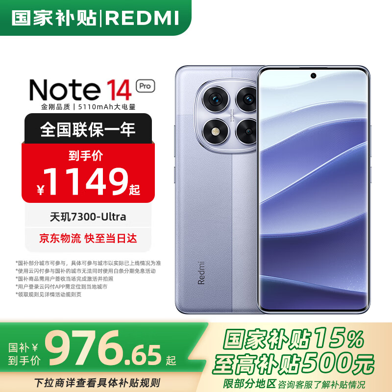 小米红米note14pro 【国家补贴15%】 新品5G小米红米手机 暮光紫 8GB+256GB