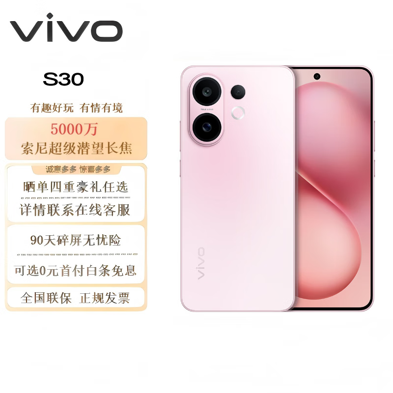 vivo S30 多彩轻薄直屏 超级潜望长焦 学生 live图 AI拍照手机 桃桃粉 12GB+256GB 官方标配+90天碎屏保