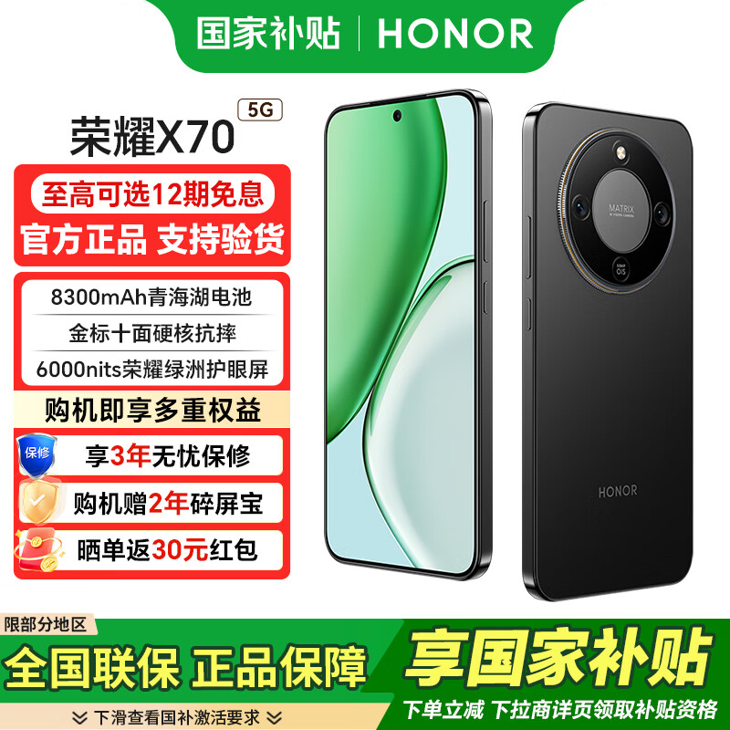 荣耀X70【国家补贴15%】新品5G手机 幻夜黑 12GB+512GB 官方标配