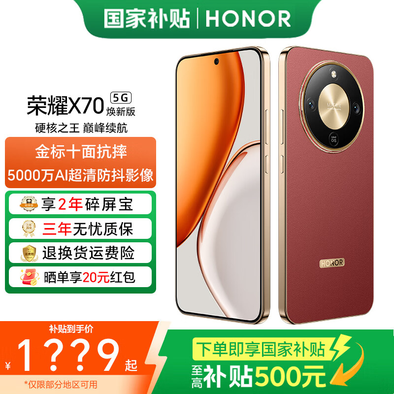 荣耀X70 焕新版【国家补贴】新品5G手机 金标十面抗摔 荣耀x70 8300mAh青海湖电池 荣耀手机 朱砂红 12GB+512GB【2年碎屏险+2年店铺延保】 官方标配