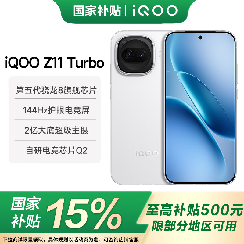 vivo【国家补贴15%】iQOO Z11 Turbo第五代骁龙8 144Hz护眼电竞屏 2亿大底超级主摄 国家补贴游戏手机 天光白 12+256GB 官方标配