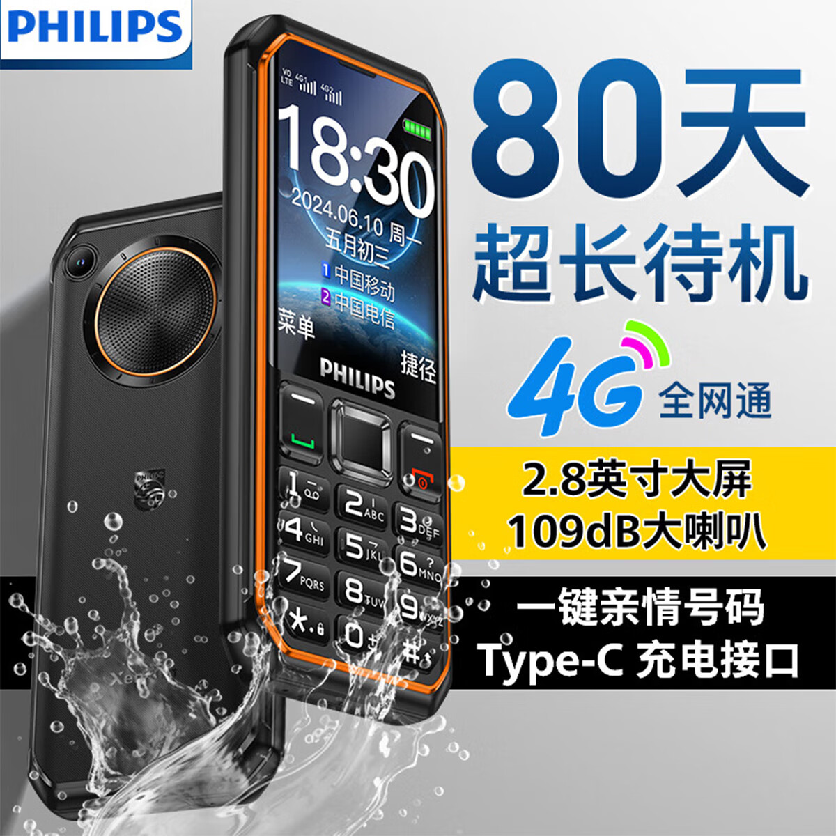 飞利浦(PHILIPS)E588 全网通4G老年人手机大电池超长待机大字体大声音老人手机移动联通电信广电学生专用机 星空黑