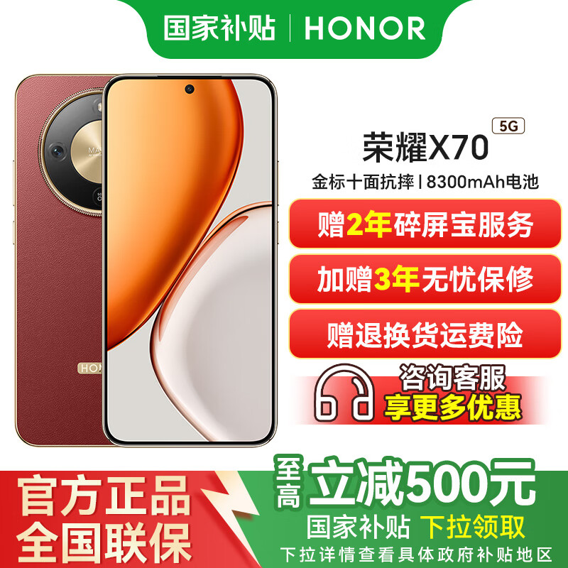 荣耀X70 【国家补贴】金标十面抗摔 8300mAh青海湖电池 IP69防水 新品5G手机 朱砂红 8GB+128GB 官方标配