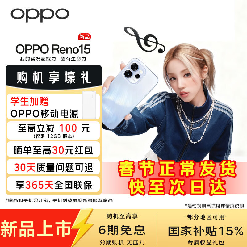 OPPO【国家补贴减15%】 OPPO Reno15 星光蝴蝶结 2亿像素超清影像 超出圈实况 5GAI拍照手机reno15 极光蓝 12GB+256GB