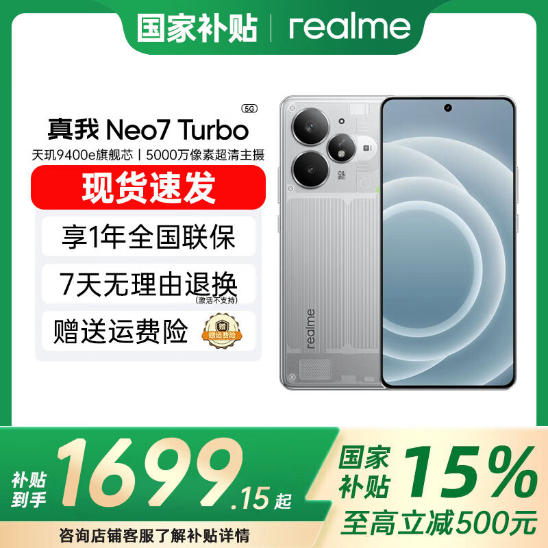 真我(realme)OPPO 真我Neo7 Turbo 新机 天玑9400e 超薄续航大电池护眼直屏 智能游戏AI性能手机 透明灰 12GB+256GB