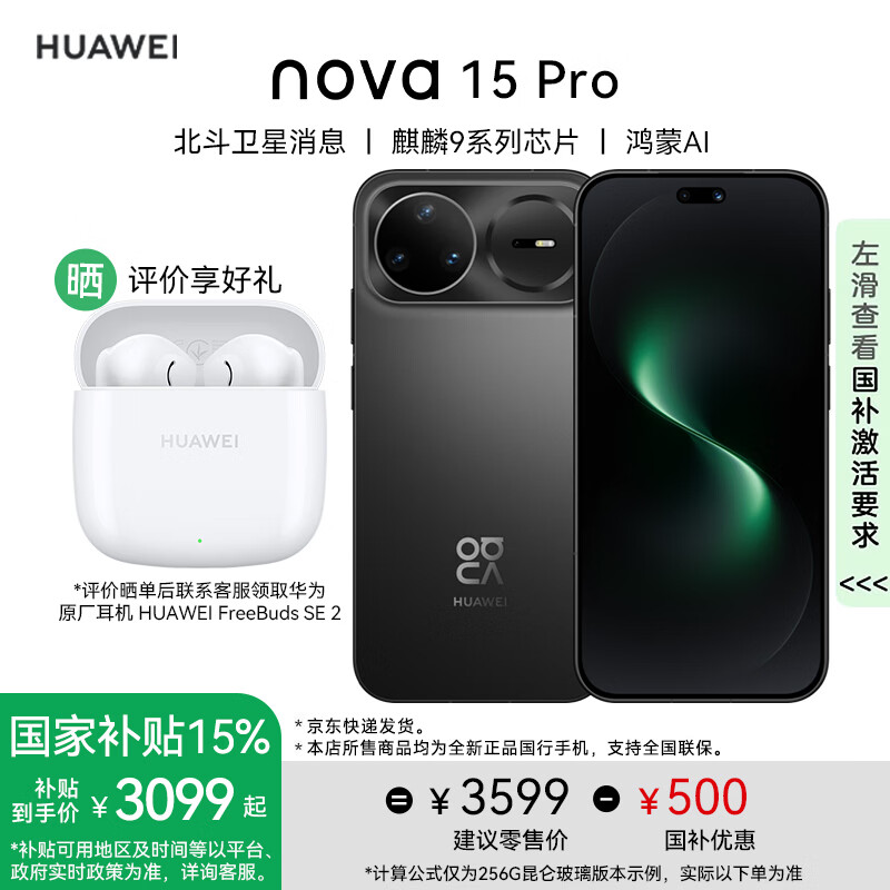 华为(HUAWEI)nova 15 Pro 手机【国家补贴500元+晒单送华为无线耳机】 幻夜黑 512GB 昆仑玻璃