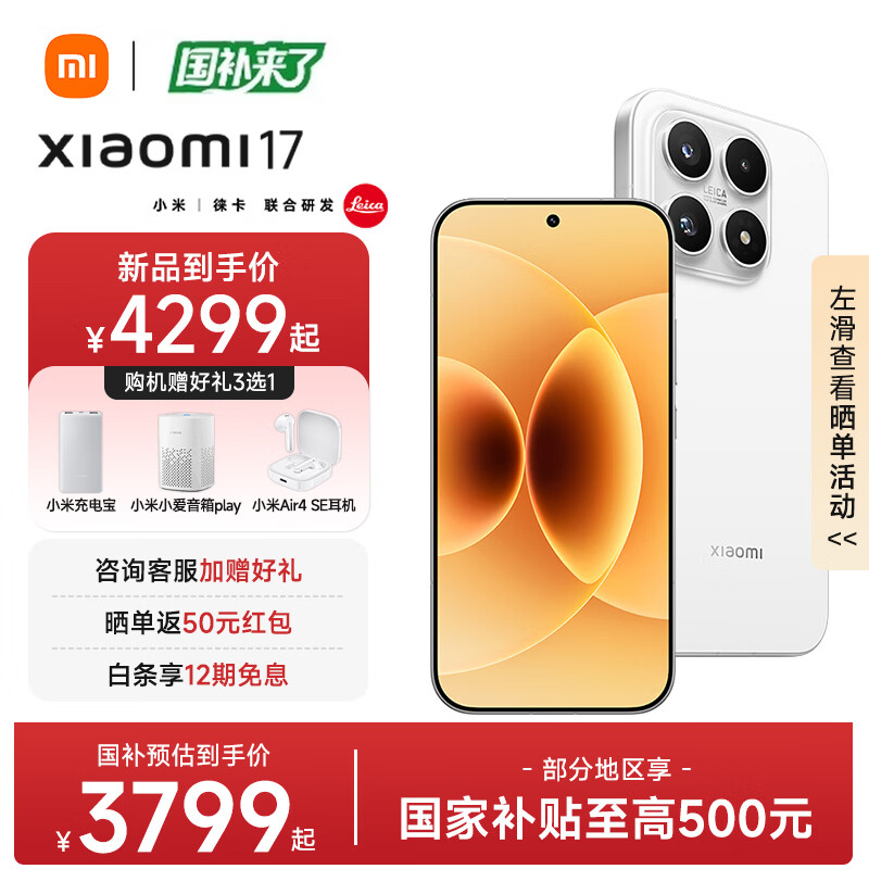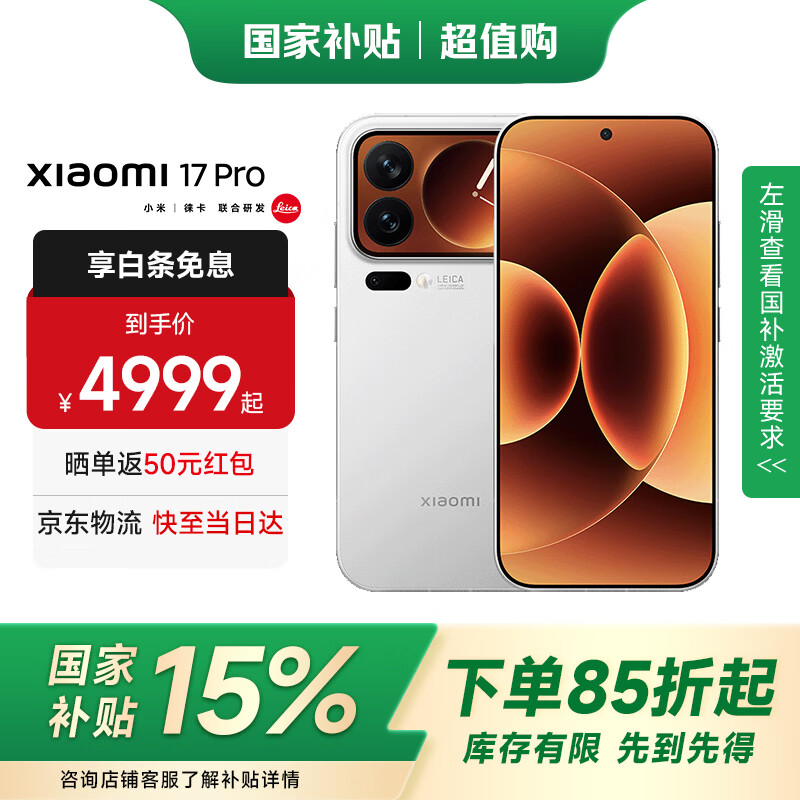小米17Pro【白条免息】 小米旗舰新品5G手机妙享背屏第五代骁龙8至尊版徕卡光影大师 白色 16G+1024G 全网通【京东物流丨白条免息】