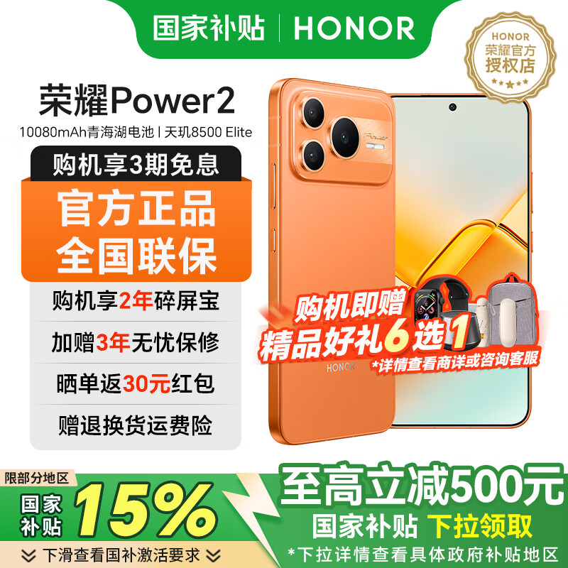 荣耀Power2 【国家补贴15%】10080mAh青海湖电池 天玑8500 Elite 新品手机 旭日橙 12GB+256GB 官方标配