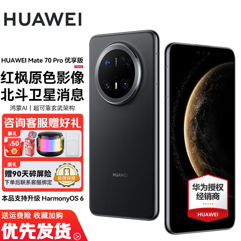 HUAWEI Mate 70 Pro优享版 旗舰手机 赠碎屏险 80W无线充电 红枫原色影像 鸿蒙智能手机 曜石黑 12+256GB 全新正品 全网通 赠碎屏险
