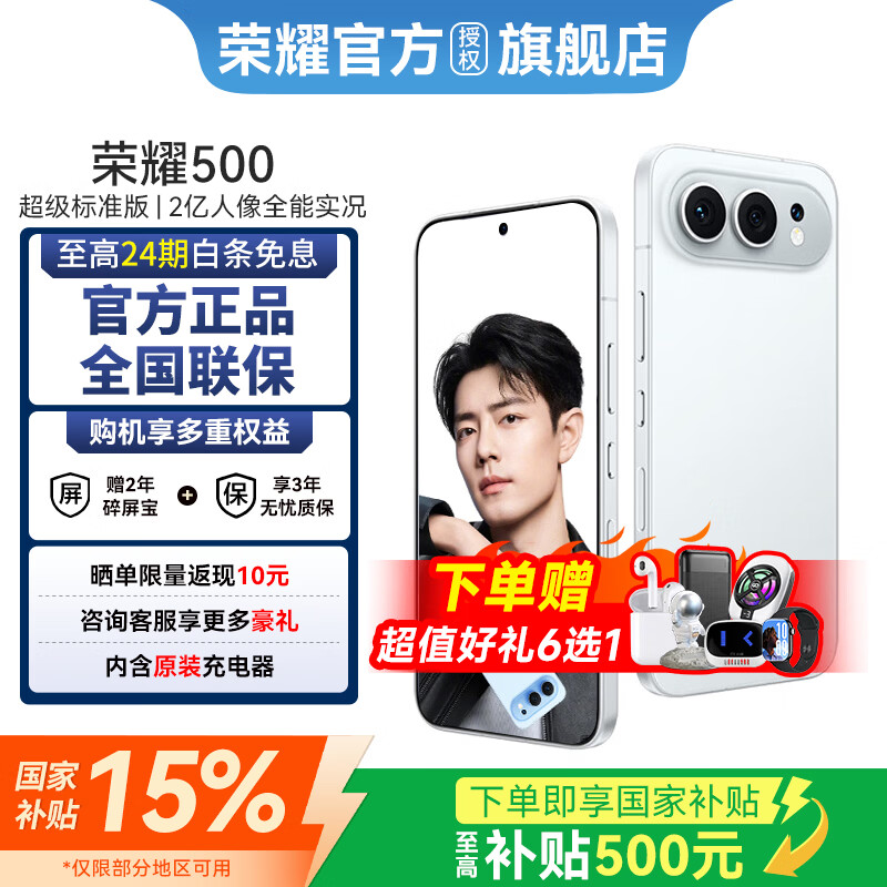 荣耀500 超级标准版 肖战同款 2亿人像全能实况 青海湖电池 5G 学生 新款拍照手机 月光银 12GB+256GB 官方标配