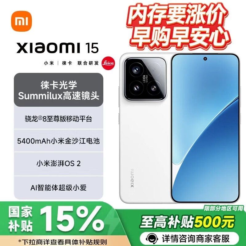 小米(MI)15【国家补贴15%】新品5G手机 骁龙8至尊版 徕卡光学影像 小米严选 白色 12+256GB 官方标配