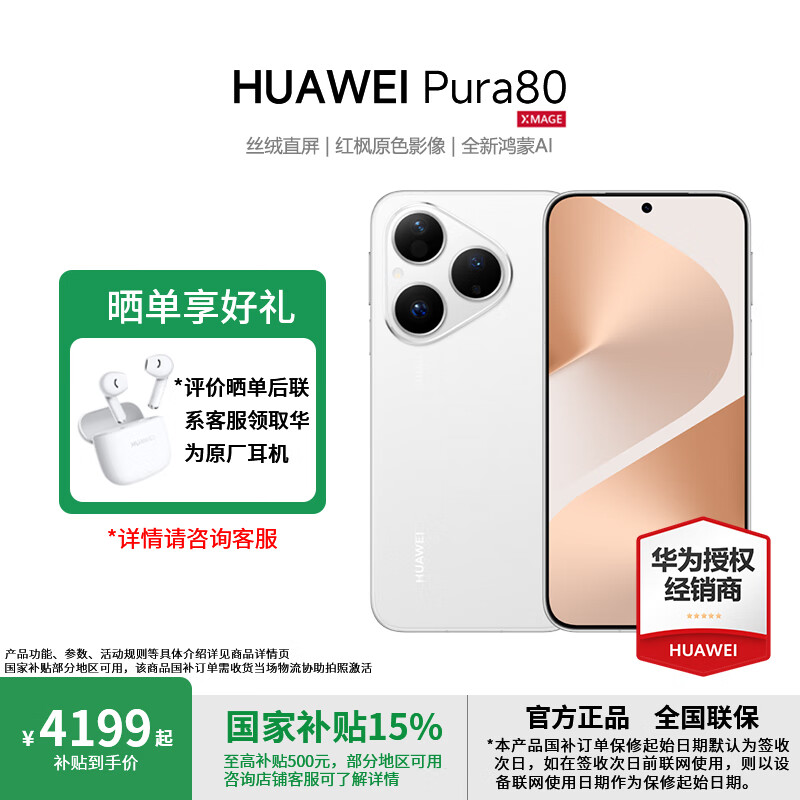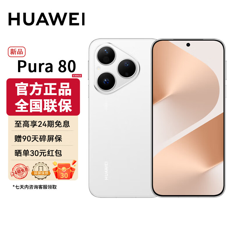 华为(HUAWEI)Pura 80 国家补贴 新品旗舰手机【现货当天发】华为p80鸿蒙智能手机 丝绒白 12GB+512GB 全网通