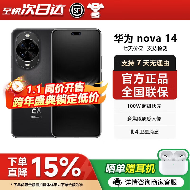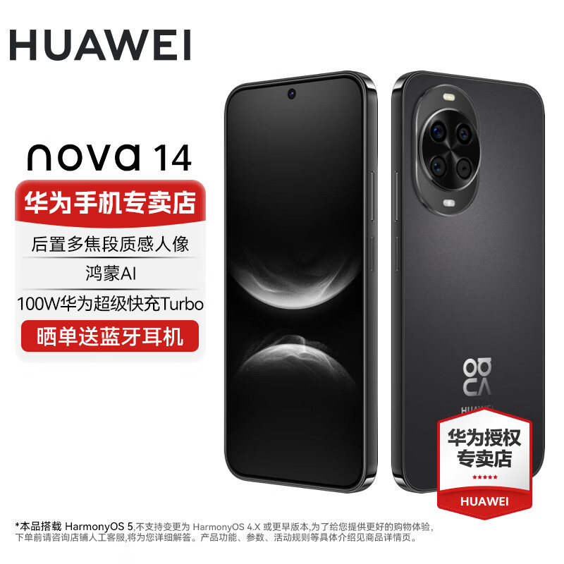 华为(HUAWEI)nova 14 后置多焦段质感人像 鸿蒙AI 100W超级快充 鸿蒙智能新品手机 nova13升级版 羽砂黑 512GB 官方标配