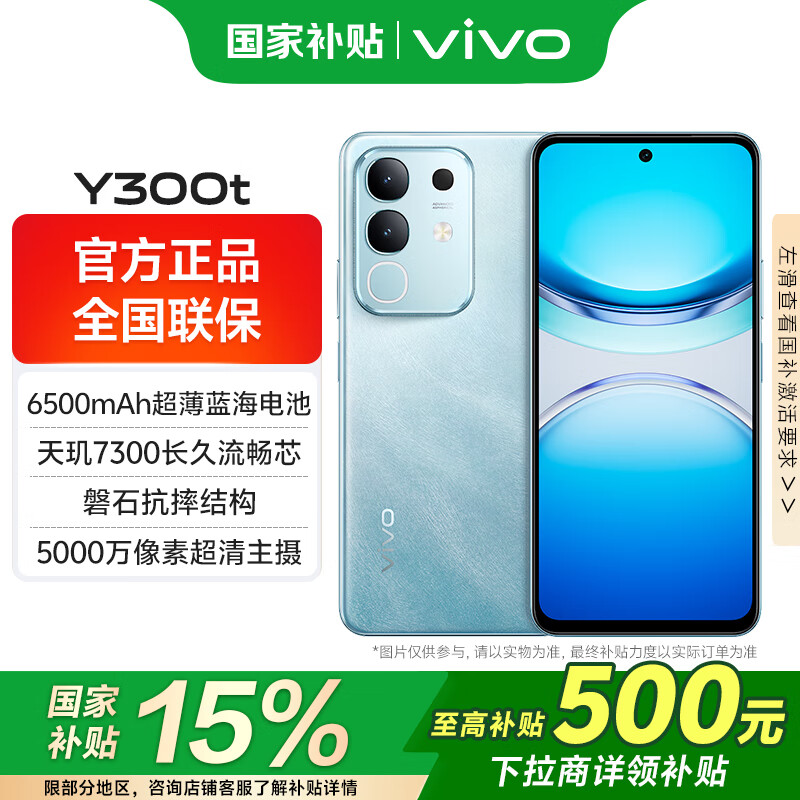 vivoY300t 国家补贴 5G新品手机 超长续航6500mAh超薄蓝海电池 磐石抗摔结构军工级耐用品质 海蓝 8GB 256GB 官方标配版