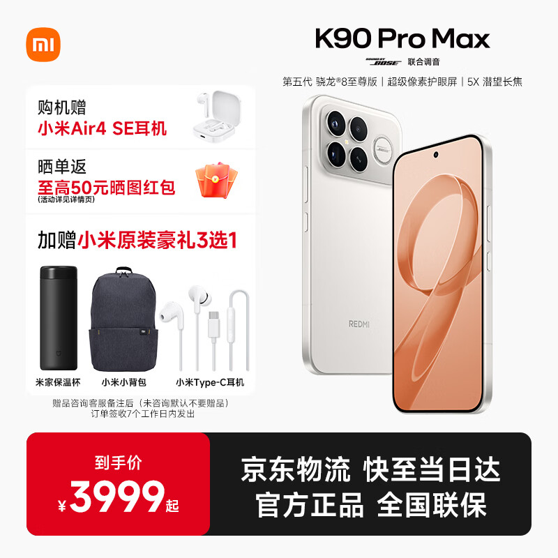 小米(MI)红米K90ProMax 新品上市 REDMI小米手机5G BOSE联合调音 第五代骁龙8至尊版 流金白 12GB+256GB 官方标配