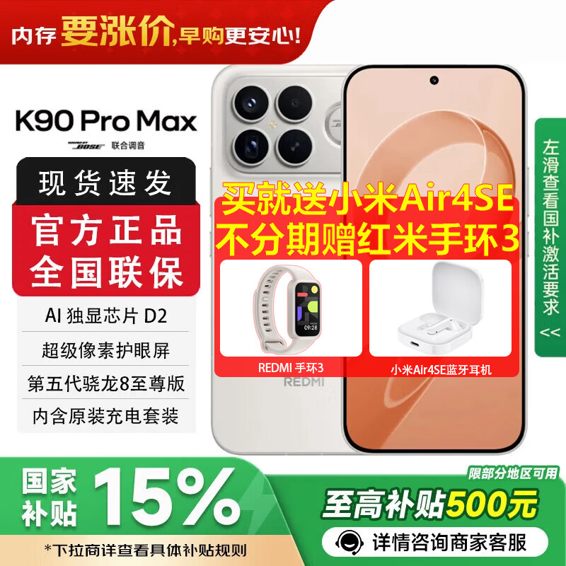 小米(MI)REDMI K90 ProMax【国家补贴15%】第五代骁龙8至尊 7560mAh大电池BOSE联合调音新品红米5G游戏手机 流金白 16+512GB 官方标配