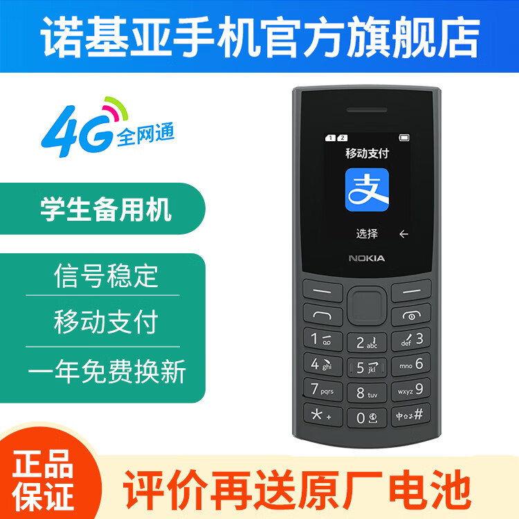 诺基亚 【评价加送原电】诺基亚Nokia 新105 4G 全网通 学生戒网备用机 大字大屏大按键 老人老年手机 黑色 官方标配