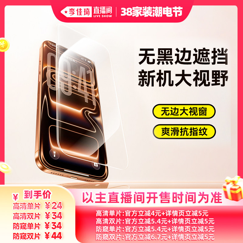 【李佳琦宠物&家装潮电节】倍思无边真防摔苹果17iPhone17Pro钢化膜16ProMax手机保护膜15防窥无尘仓贴膜