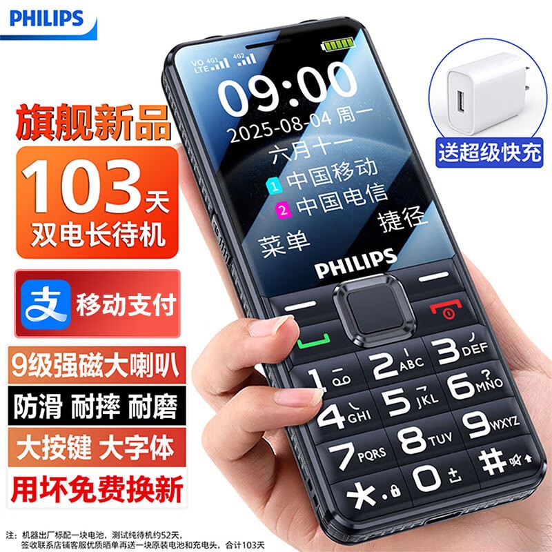 [官方旗舰店]飞利浦2025年新款老年手机4G全网通正品超长待机老人机大屏幕大字大声音男女电信版学生机