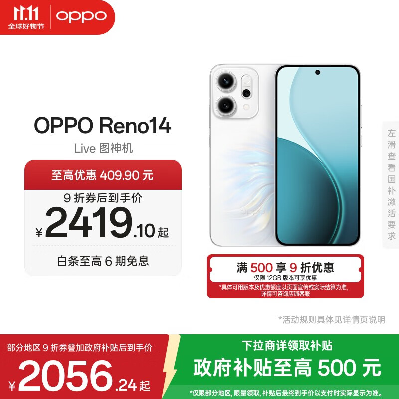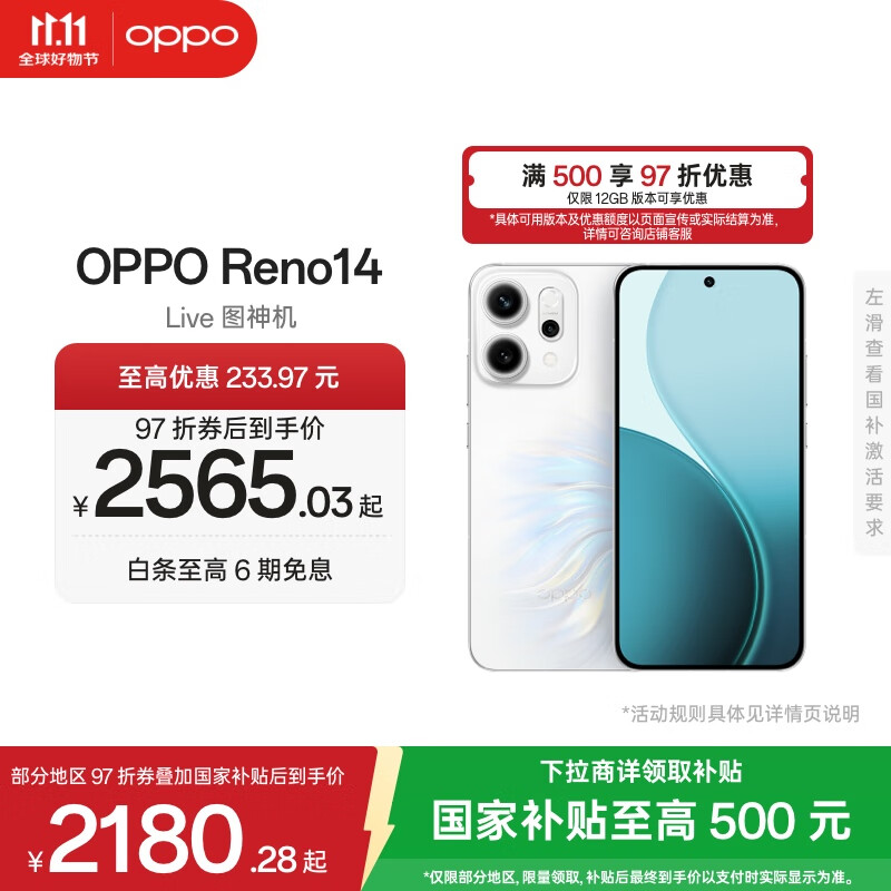 OPPO Reno14 高清长焦实况 全新小直屏Live图 AI拍照5G智能手机 IP69满级防水 人鱼姬 12GB+256GB