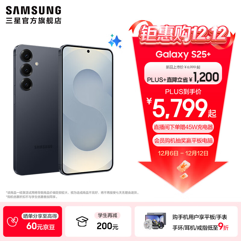 三星(SAMSUNG)Galaxy S25+ 超拟人AI助理 增强的视觉影像 骁龙8至尊版移动平台 AI手机 【专属色】幽蓝黑 12GB+256GB 官方标配