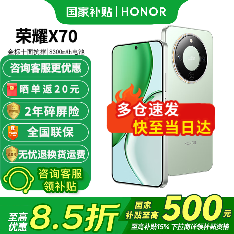 荣耀x70 新品5G手机 手机荣耀 国家补贴 竹韵青 8GB+128GB全网通 官方标配【2年碎屏险】