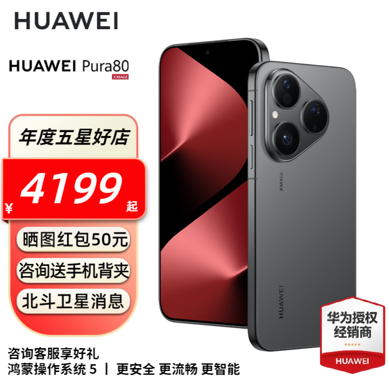 HUAWEI Pura 80 新品华为手机p80 丝绒直屏 红枫原色影像 全新鸿蒙AI 华为pura80手机 现货速发 丝绒黑 12GB+256GB 全网通