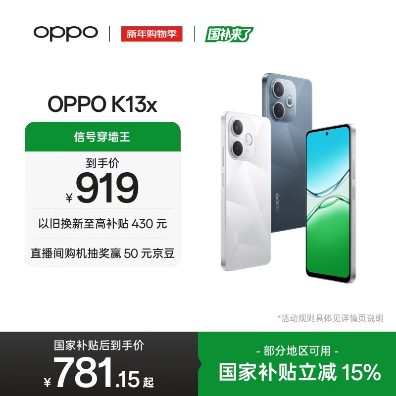 OPPO K13x 8GB+256GB 钻白 天玑6300 IP69防尘防水 大容量电池 千元老人智能 LCD屏5G手机 国家补贴